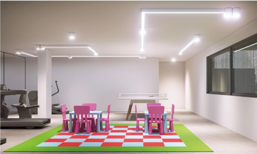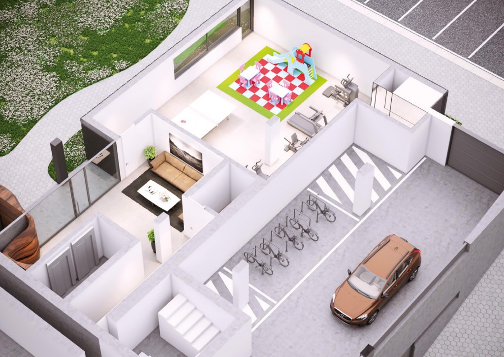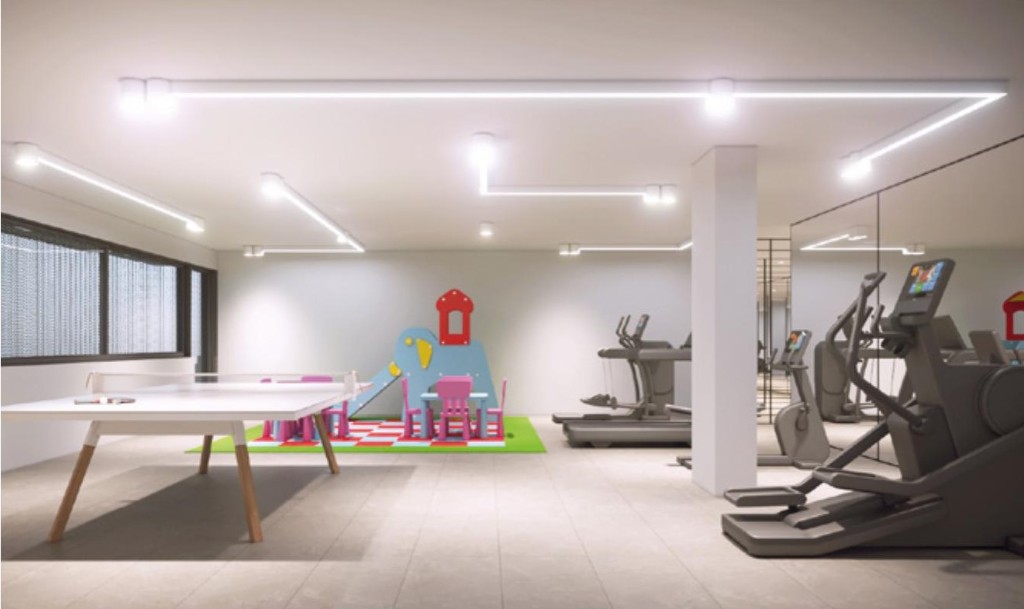 Poderá ainda usufruir de espaçosas áreas comuns, pensadas na utilização familiar quotidiana e facilmente adaptáveis a eventos especiais. Rés do chão, com cerca de 512m2, divididos entre garagem com 7 lugares de estacionamento com 1 lugar de estacionamento com tomada para carregamento de carros elétricos, sala de condomínio/ginásio com 144m2, parqueamento para bicicletas e espaço fechado para arrumos.
