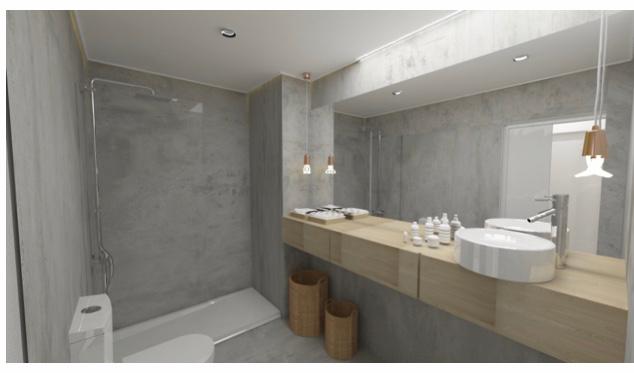 paredes dos wc`s em material rectificado ou equivalente/estucadas e pintadas; espelhos nos